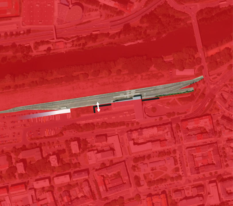 Důležitá myšlenka návrhu, budovy se stávají rozšířením pěších propojení k řece. Bude tedy možné se k řece dostat z podchodů skrze nové budovy. Poté podél řeky uvažuji živý parter se službami, restauracemi a relaxem.